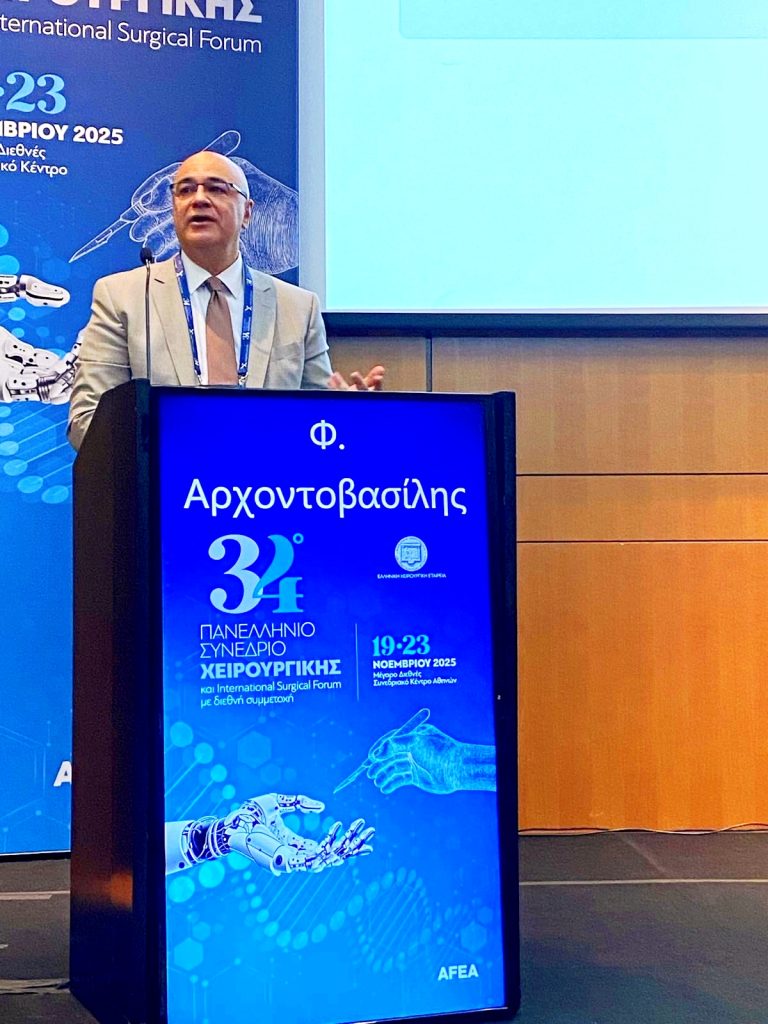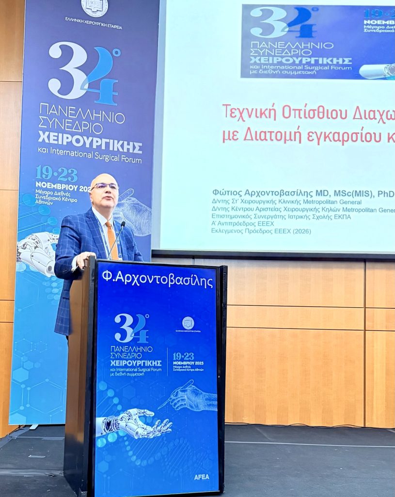 Ιδιαίτερη τιμή για τον Δρ. Φώτη Αρχοντοβασίλη η ενεργή συμμετοχή του στο 34ο Πανελλήνιο Συνέδριο Χειρουργικής & International Surgical Forum της Ελληνικής Χειρουργικής Εταιρείας, που πραγματοποιήθηκε από τις 19 έως τις 23 Νοεμβρίου στην Αθήνα. Στο πλαίσιο του Συνεδρίου παρουσίασε δύο ομιλίες με επίκεντρο τις κήλες του κοιλιακού τοιχώματος, έναν τομέα όπου η χειρουργική γνώση εξελίσσεται σταθερά και απαιτεί υψηλή εξειδίκευση.
